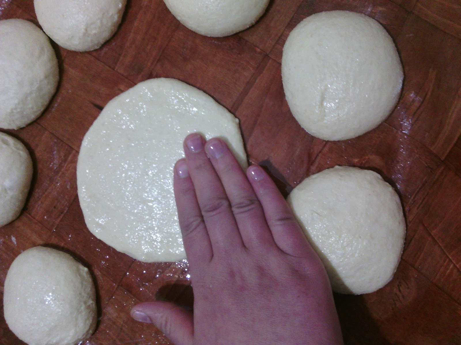 نعجن العجينة جيدا حتى تصبح طرية ثم نضيف البيض بالحبة ونعجن حتى يدخل في العجينة كليا. نضيف الماء الدافئ تدريجيا ونعجن حتى تطرى العجينة (تكون شوية جارية) نلمها بالزيت ونضعها في طنجرة مدهونة بزيت دافئ نغطيهنا ونضعها في مكان دافئ . نتركها تتخمر من نصف ساعة إلى 45دقيقة ( ما نخليهاش تطلع بزاف حتى تكمل الطلعة في المقلاة) نضع العجينة في القصعة ونحممها حميمات الحجم الذي تفضلونه. نسخن الزيت في المقلاة ندهن السطح بالزيت ثم نسبط الحميمة على شكل دائري ونعمل فتحة في الوسط.